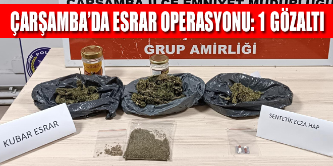 Çarşamba İlçe Emniyet Müdürlüğü ekiplerince gerçekleştirilen esrar operasyonunda 182 gram kubar esrar maddesi ve 2 adet sentetik ecza hap ele geçirilirken 1 şahıs gözaltına alındı.